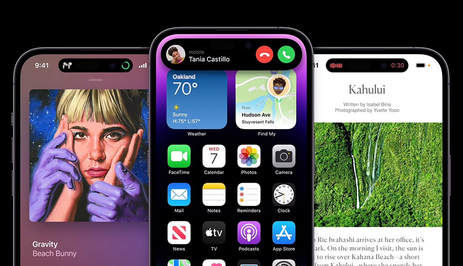 O iPhone 14 Pro destaca-se pela inovação na ilha dinâmica (Dynamic Island) e no ecrã sempre ligado (always on) com 120 Hz.